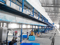 手套模型先經(jīng)酸堿清潔、水清洗,洗凈的模型先浸入熱水加熱后至浸凝固劑并干燥進行浸膠。浸膠后送烘箱初步烘干、加纖維內(nèi)套、沖熱水再送至烘箱硫化、烘干成型。手套脫模后充氣檢查、低溫定型、中溫干燥、水洗、脫水、烘干后再包裝送成品倉庫。